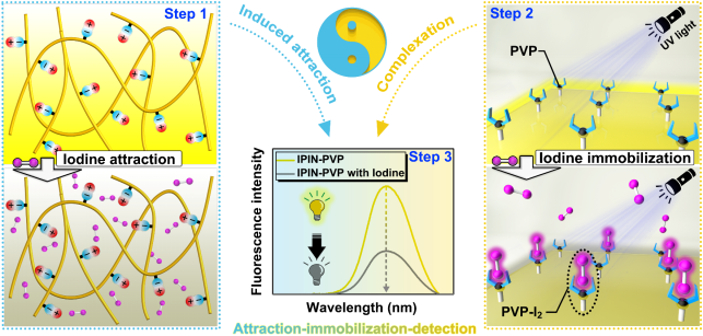 何玲团队设计了一种基于离子液体的光致发光离子聚亚胺网络(IPIN),与PVP结合作为碘亲和添加剂,制备成IPIN-PVP复合膜材料,用于挥发性碘的现场荧光检测。通过协同利用IPIN的离子诱导吸引效应和PVP对碘的络合效应,提出一种吸引-固定-检测(AID)的荧光传感策略,使IPIN-PVP膜在捕获空气中微量碘方面表现出增强的能力。实验结果表明,优化后的IPIN-PVP对气态碘具有突出的检测性能,同时实现了最快5秒的响应时间和4.087×10-8 M的低检测限。此外,所制备的IPIN-PVP具备良好的柔韧性和自愈合特性,可以被进一步加工成手持式荧光传感设备。该材料的提出为挥发性碘的实时现场检测提供了一种新的解决方案,也为核能发展背景下的环境质量安全监控提供了一种潜在的技术手段。