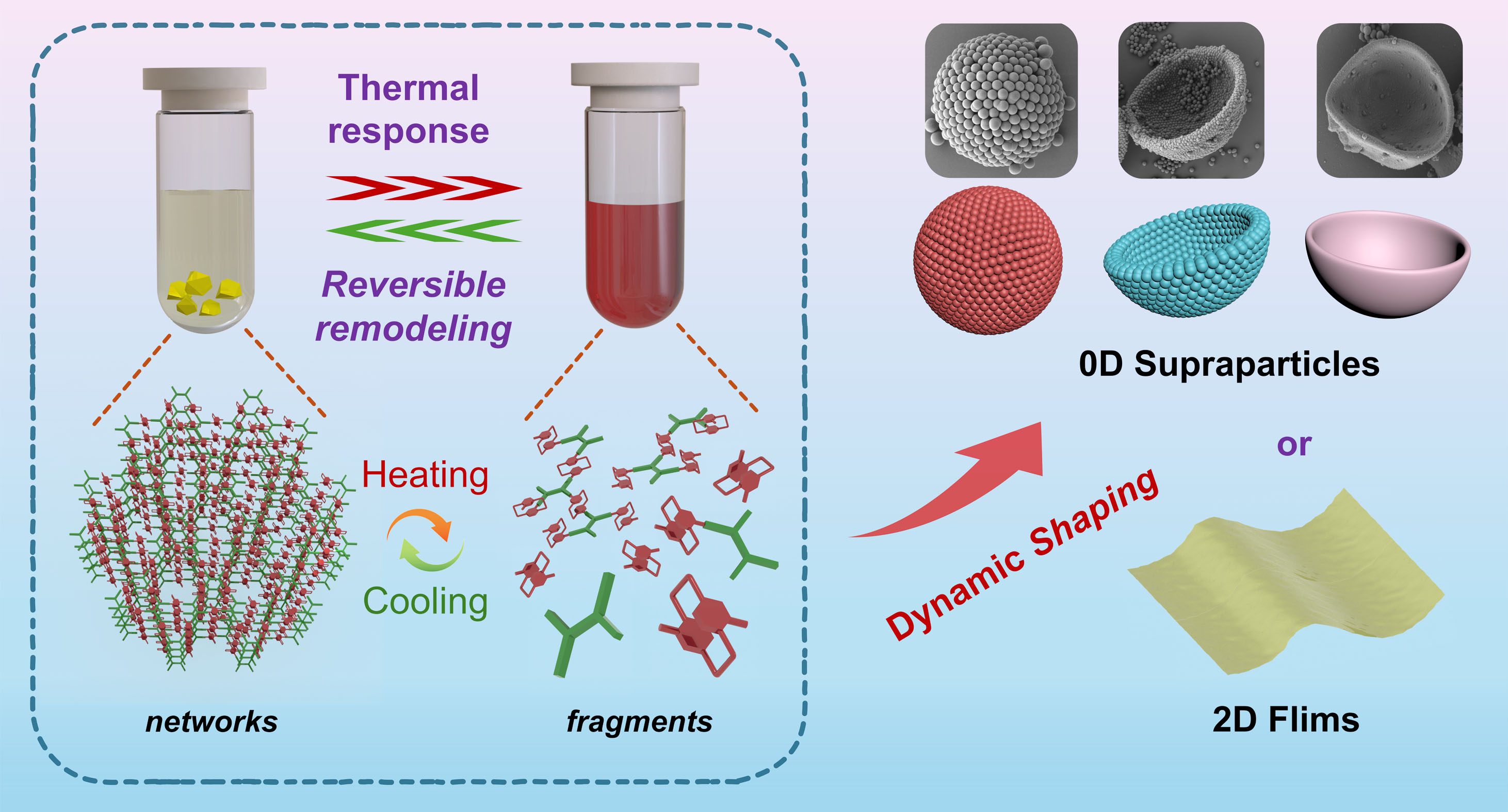 马利建课题组首次提出了一种基于可溶性共价有机网络(SCONs)的超结构热响应动态合成策略,该策略能够实现从0D空心超粒子到2D薄膜的形态调节,从而便捷地制备得到多维复杂超结构材料。机理研究表明,得益于构建单体(4,12-二甲酰基[2.2]对环芳烷)的独特双层结构,SCONs具有“裂解-重塑”的结构转换特性,可以通过温度控制实现从可逆溶解、重组到超结构构建的动态过程。具体实验中,通过液滴喷射技术获得油包水乳滴,即可在油-水界面原位高效制备出0D球形空心超粒子以及其他类碗状的复杂超结构。此外,通过调节外源溶剂的挥发性和溶解性,还可在气-液界面制备出无缺陷的2D薄膜材料。扩展实验进一步证实了所提出的动态“裂解-重塑”策略的普适性和可扩展性。对客体碘分子的富集研究发现,相比于单一层次结构的材料,超结构材料具有更加卓越的动力学传质性能,进一步证实了材料微观结构对其宏观功能性质的重要影响。