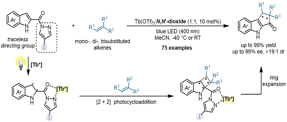 近日,冯小明课题组通过在吲哚底物中引入含有重原子基团且具有双齿螯合作用的吡唑酰胺基团,以手性双氮氧镧系金属配合物为Lewis酸催化剂(冯催化剂),高效高选择性地实现了可见光催化吲哚底物与简单烯烃的催化不对称[2+2]环加成/扩环串联反应。底物普适性良好,各种一取代、二取代和三取代烯烃均可以顺利转化为具有重要用途的手性吲哚并环戊酮类衍生物。