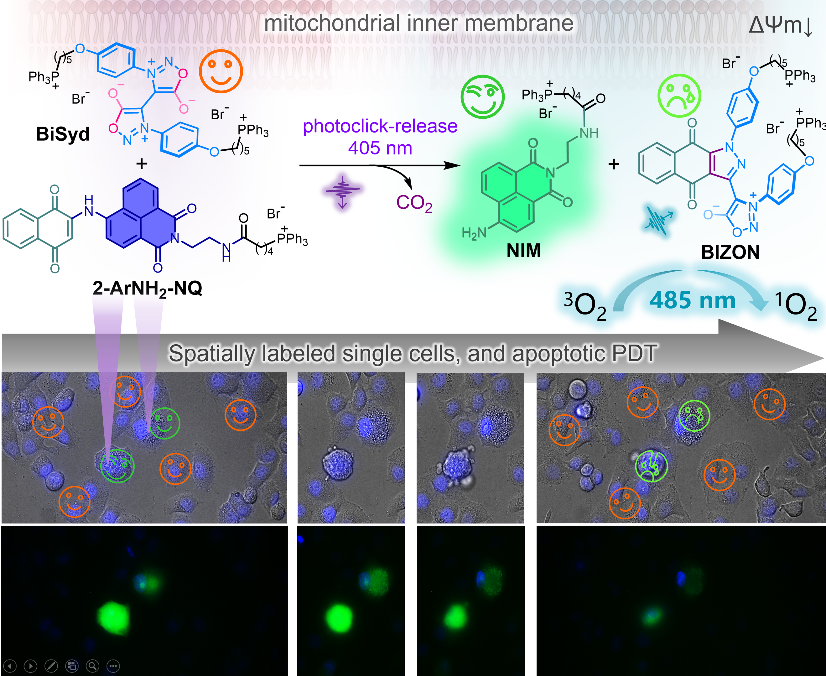 图1. 可见光激发的“光点击-释放”反应系统,用于单细胞示踪和精准PDT杀伤概念图。