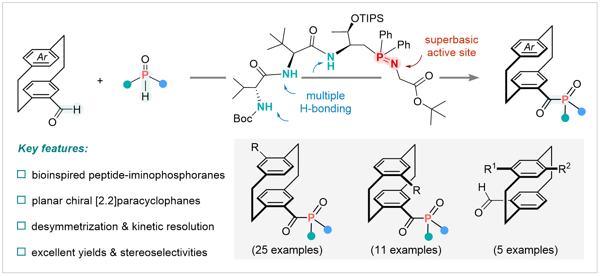 王天利教授团队通过合理设计并开发了一类新型的手性肽-膦亚胺(PIMPs)超强碱催化剂,利用该有机强碱催化剂的协同作用,实现了不对称Pudovik加成反应和氧化反应的复杂串联过程,分别以去对称化和动力学拆分方式高效高选择性合成了一系列取代的[2.2]对环蕃分子(图1)。