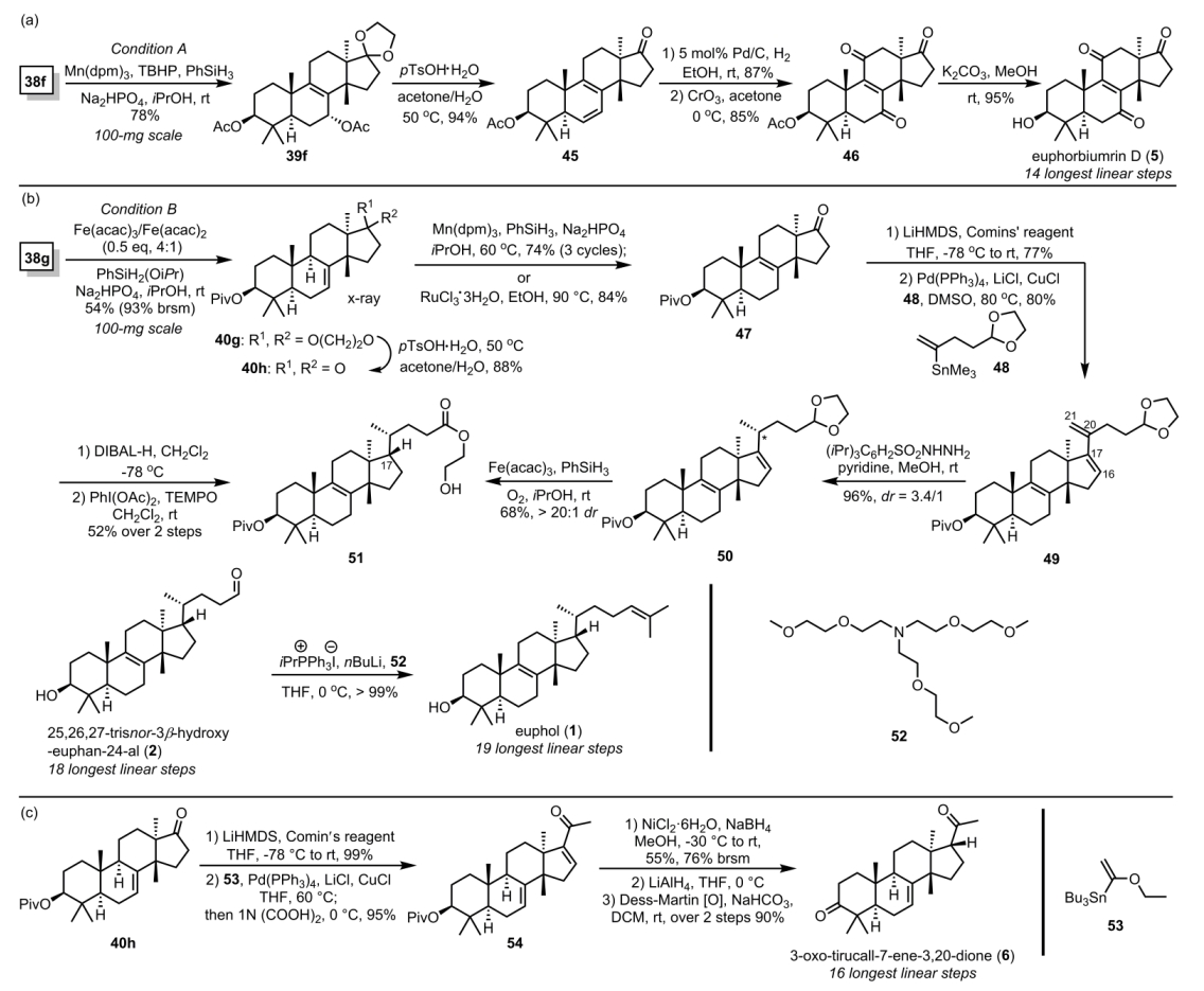 选取环化前体38g,在金属铁的标准条件下发生MHAT环化反应,制备环化-消除产物。该化合物经脱除乙二醇和双键异构化生成四取代烯烃。通过Stille偶联将边链引入,随后选择性氢化、MHAT氢化-缩醛氧化串联反应合成酯化合物。最后经官能团转化,合成天然产物25,26,27-trisnor-3b- hydroxy- euphan-24-al,再发生一步Wittig反应合成天然产物euphol(图5b)。