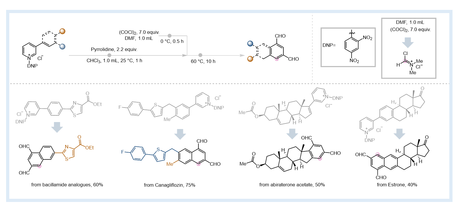 付海燕/陈华团队发展了一种创新的吡啶骨架编辑方法,本研究团队通过精心设计反应路径,利用Vilsmeier试剂作为双亲电试剂,在精确调控的反应条件下,成功实现对吡啶开环中间体的亲电修饰,从而高效地将吡啶类化合物转化为1,3-双醛基芳香化合物。该方法具有优异的底物普适性,最高产率可达90%,并能应用于糖尿病药物卡格列净、前列腺癌药物阿比特龙等生物活性分子的后期修饰。所得双醛产物可作为关键合成砌块,进一步衍生为多种功能分子。该研究在实现分子骨架精准编辑方面取得了重要突破,为药物研发和功能分子构建提供了一种全新的工具和思路。