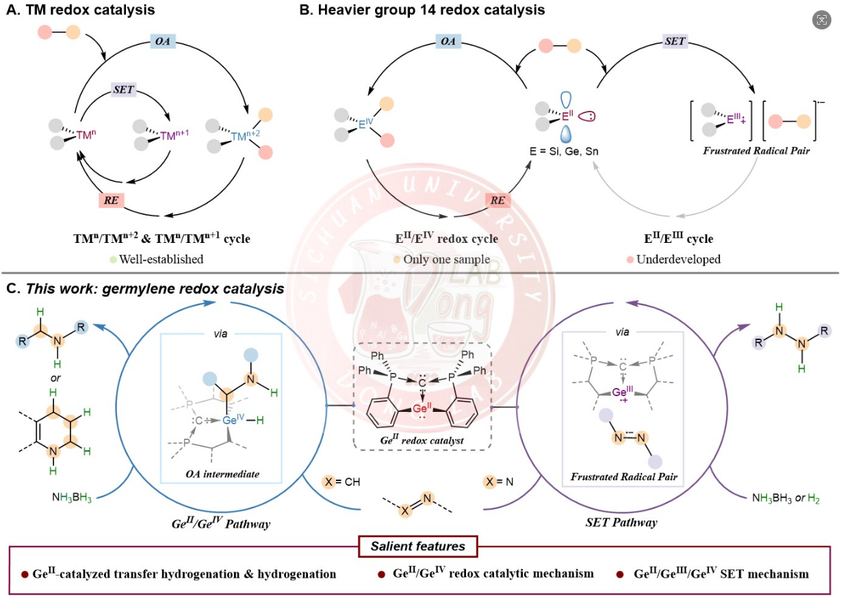 董召文课题组利用三齿碳二磷烷钳形配体成功稳定了具有二价锗中心的配合物,并系统探索了其在催化转化中的应用。研究显示,该二价锗试剂在温和条件下能够以氨硼烷为氢源,高效催化偶氮芳烃及亚胺的转移氢化反应。机理研究表明,锗中心存在两种不同的催化路径:一种为基于Ge(II)/Ge(III)/Ge(IV)循环的单电子转移过程,另一种为Ge(II)/Ge(IV)循环的双电子转移机制。此外,课题组进一步实现了Ge(II)/Ge(IV)催化体系下N-杂芳烃的选择性去芳构化反应。该工作不仅拓展了低价重十四族元素试剂在变价催化中的应用范围,也为开发具有准过渡金属行为的主族元素催化剂提供了重要的实验依据与理论支撑。