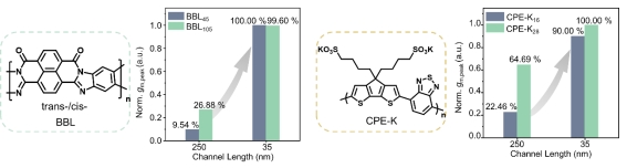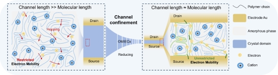冯良文研究员团队提出了沟道限域效应(channel confinement effect):当沟道长度(L)远大于弱结晶聚合物分子链长度时,载流子主要通过分子间的跳跃机制传输;而当L减小至接近弱结晶聚合物分子链长度时,聚合物链能够直接桥接上下电极,从而通过链内传导途径实现高效载流子输运(图1)。针对代表性的n型(BBL)与p型(CPE-K)聚合物基OMIEC材料开展研究,显著减弱或消除了分子量和批次间差异带来的影响。