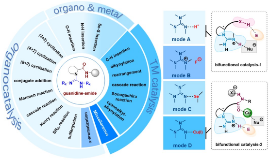 受脯氨酸双功能性质启发,刘小华教授/冯小明院士团队通过将羧酸部分改造成结构可调的酰胺、将氨基部分与碳二亚胺作用生成胍基,合成了一类新型双功能胍-酰胺配体和催化剂。经过10余年的研究,先后发展出了单胍、双胍及其单盐、胍-酰胺-磺酰胺、胍-酰胺-吡啶以及季氮胍盐等多类衍生物,极大地丰富了手性胍-酰胺配体和催化剂库。在应用方面,实现了胍-酰胺由有机小分子催化到金属/有机小分子组和催化、金属配合物催化、相转移催化等多种催化模式的拓展;反应类型也由极性加成、环化拓展到卡宾插入、偶联、自由基反应和光催化转化等。