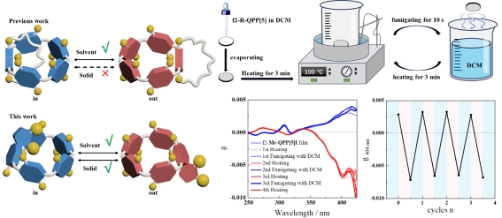 刺激响应型分子器件在传感、材料等领域备受关注,其中能切换手性构型、产生光学信号反转的系统尤其具有应用潜力。这类手性光学开关通常依赖分子构象的可逆变化,在溶液中已得到较好实现,但固态下的分子堆积和空间位阻使得其构象切换与信号调制极为困难,限制了其实际应用。柱芳烃是一类具有独特平面手性翻转特性的大环化合物,是构建此类开关的理想平台。先前研究基于其开发的“分子万向节”等开关,虽在溶液中表现出色,但在固态下仍受限于紧密的分子堆积,难以实现有效的手性调制。因此,开发能在固态环境中工作的、高效的手性光学分子开关,是本领域一个重要的挑战。