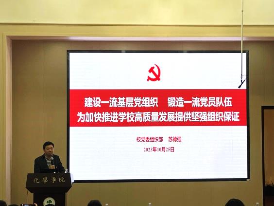 校党委组织部副部长苏德强作题为《建设一流基层党组织,锻造一流党员队伍,为加快推进学校高质量发展提供坚强组织保证》的主题报告。他指出,要准确把握一流党组织和一流党员队伍建设的实践要求;支部要充分发挥战斗堡垒作用,着力建设一流组织;党员要突出立足岗位主动作为,着力锻造一流队伍。他强调,推进基层党建工作要勇于担好一流党组织、一流党员队伍建设的职责使命,将党的政治优势、组织优势和密切联系群众优势转化为推动高质量发展的动力和优势。