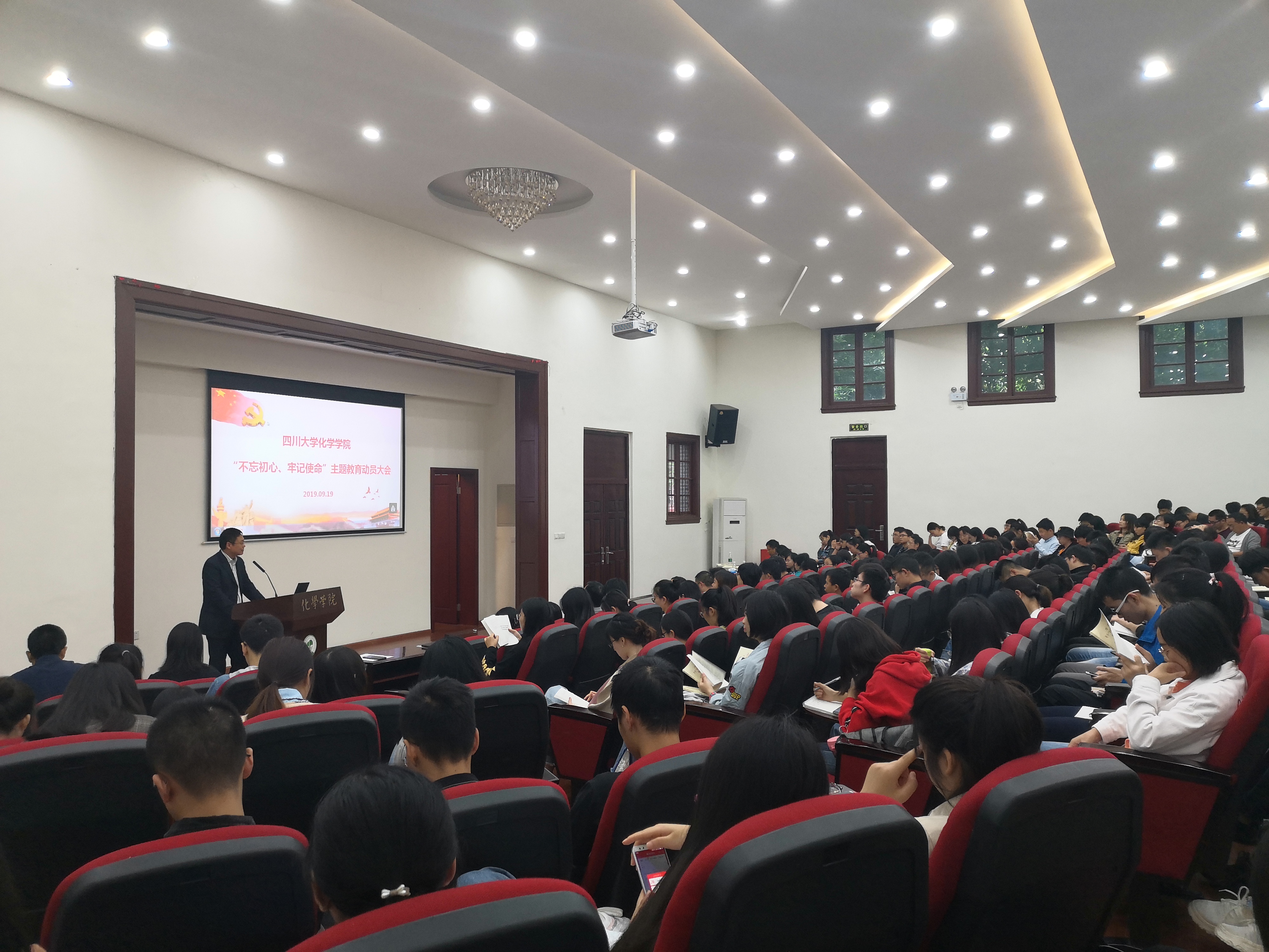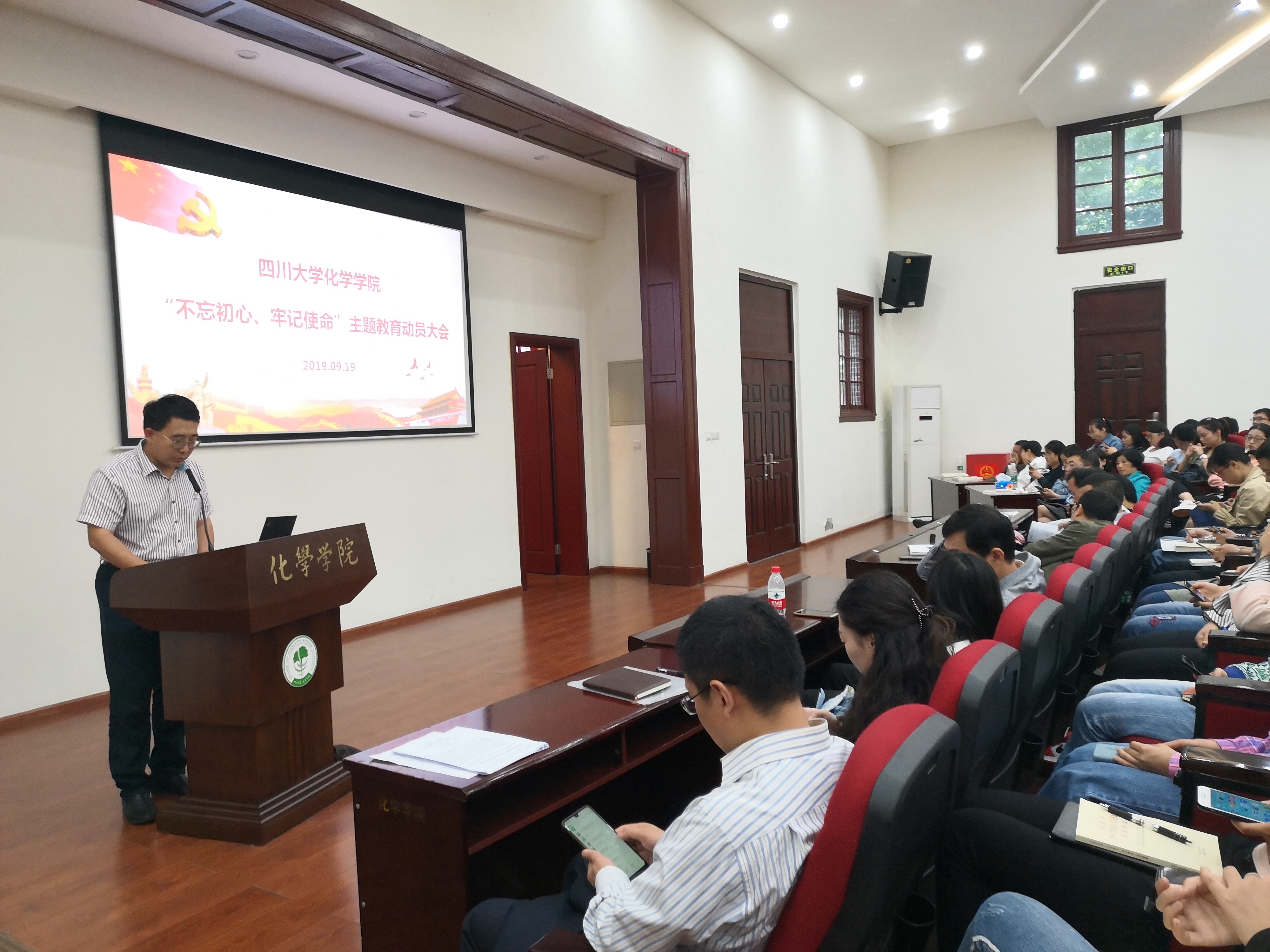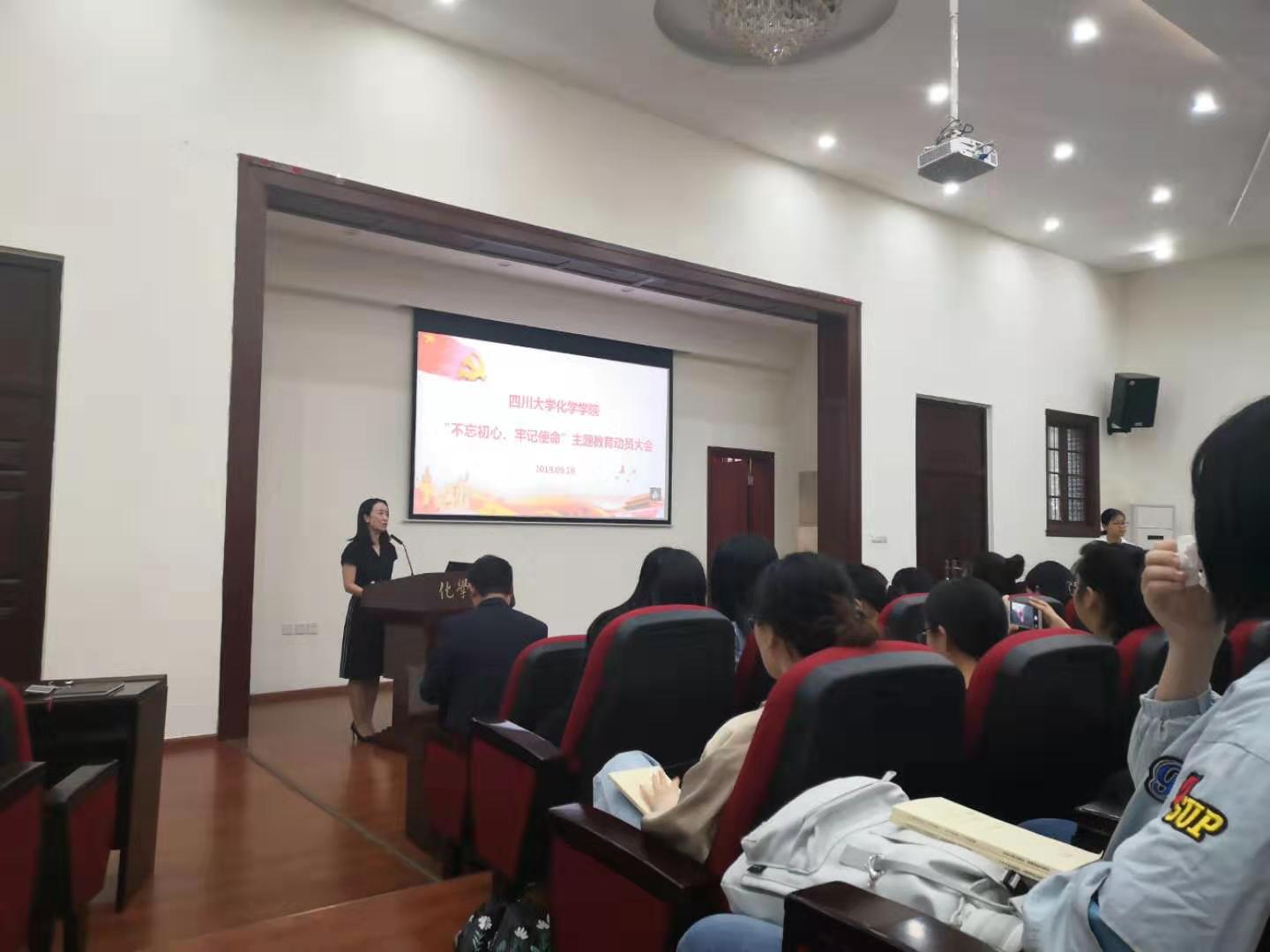 在望江校区化学管321举行了“不忘初心,牢记使命”主题教育动员大会。学校第五指导组组长、研究生院副院长兼研究生工作部部长李栓久、组织部副部长管清贵、“双一流”及质量评估办公室尹怡副处长以及其他小组成员莅临了本次动员大会。