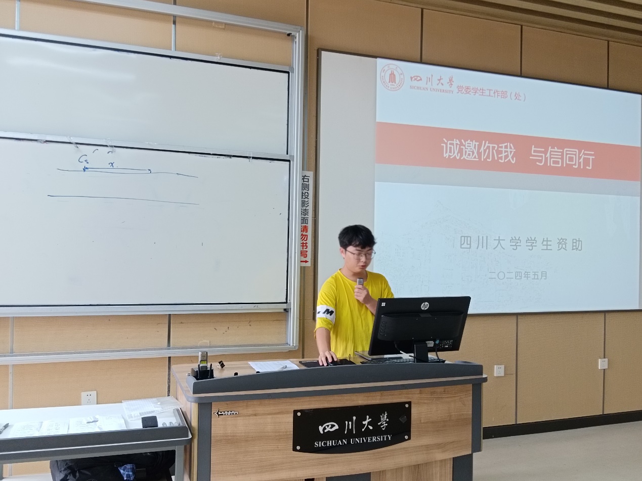 2023级阳光资助宣传员马海涛同学主讲。马海涛同学分别从资助诚信的概述、资助诚信的重要性、资助过程中的不诚信问题、如何建立和维护资助诚信、防诈骗等方面进行了详细讲解。随后,马海涛同学分享了自己对于资助诚信的理解,以及一些典型的资助诚信和不诚信的案例,突出了本次宣讲的主题。最后,马海涛同学分享了学校的资助政策及申请要求、申请流程,为同学们答疑解惑。