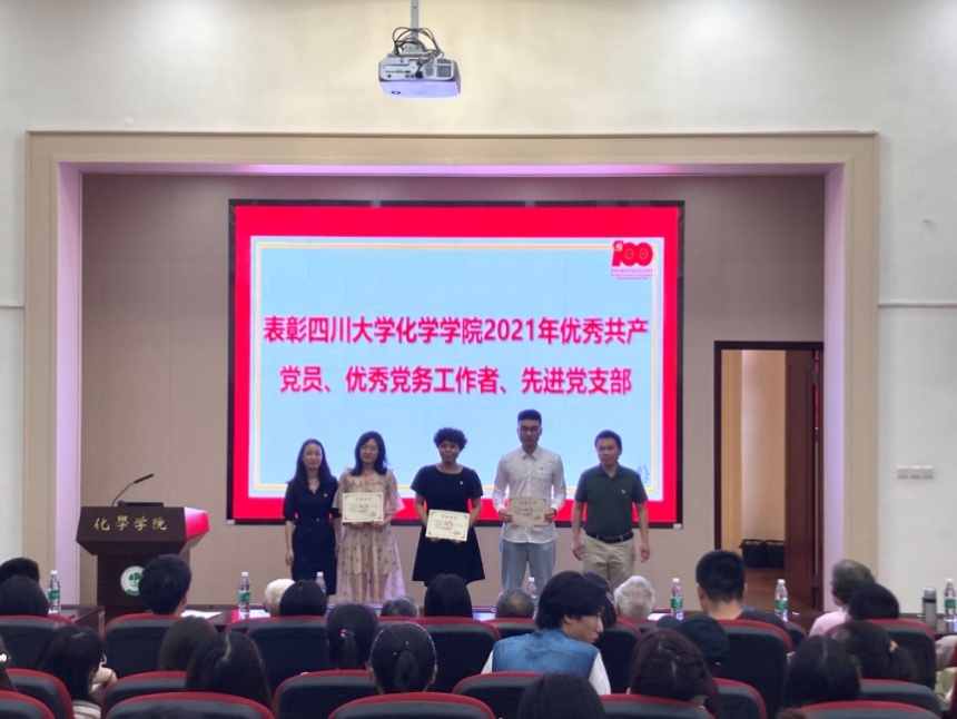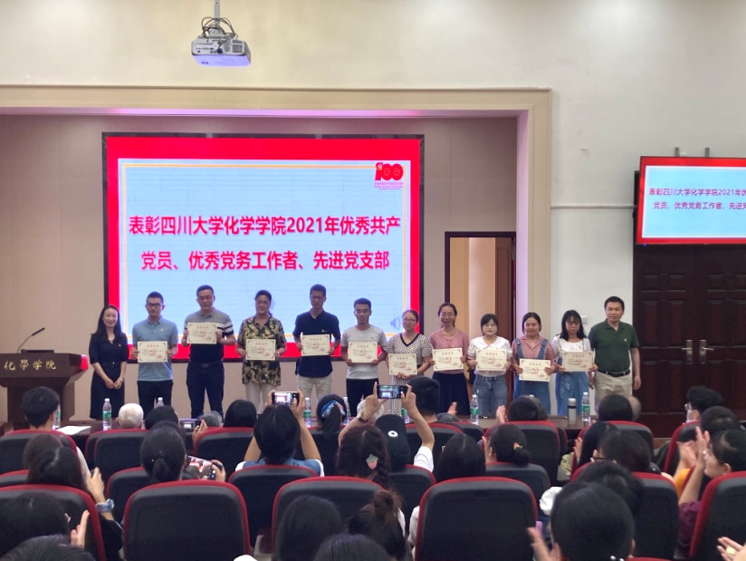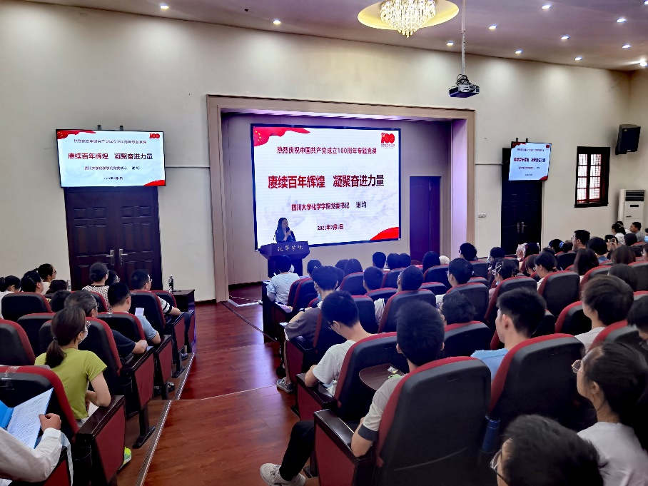 庆祝建党100周年专题党课暨“七一”表彰大会在化学馆321报告厅隆重举行。学院党政领导、党委委员、纪委委员、专职组织员、支部书记及支委、民主党派代表、离退休党员代表、在职教师党员代表、学生党员代表及全体预备党员参加了本次大会。大会由院党委书记谢均同志主持,大会在齐唱《中华人民共和国国歌》声中拉开帷幕。