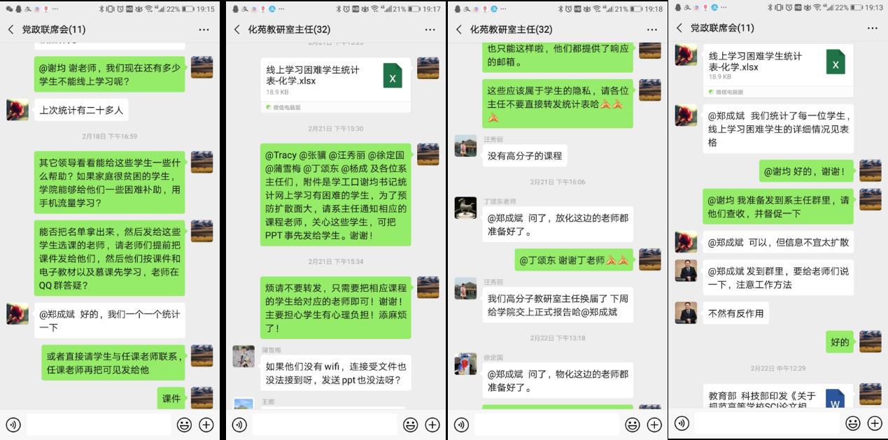 相关通知要求,延迟春季开学返校时间,做到“停课不停教,停课不停学”。全院师生按照既定的开学时间准时行课,开展网上教学指导与学习。前期学院领导班子通过多次线上党政联席会讨论,并联动教务口、学工口、任课教师摸排参与线上学习有困难学生名单、湖北籍和武汉籍学生,了解学生实际困难,采取多种模式帮助学生展开线上学习,如任课教师将电子课件以及视频通过QQ或邮件发给学生;同时拟采取任课教师与辅导员互动协调的工作模式,对每门课参与线上学习困难的学生进行询问进行追踪、联系和回访,确保电话、短信、微信和QQ进行答疑顺畅进行。此外,拟为困难学生提供通讯补助,便于通过手机在线学习。