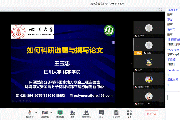 王玉忠院士作为一名老党员,把投身防控疫情第一线作为践行初心使命、体现责任担当的试金石和磨刀石,积极主动履职,有效发挥作用,通过“腾讯会议”网络平台开展了题为“如何进行科研选题与撰写学位论文”的专题讲座。尽管有约500人报名参加,但因会议平台的人数限制,有300名研究生和本科生有幸参加了本次讲座。