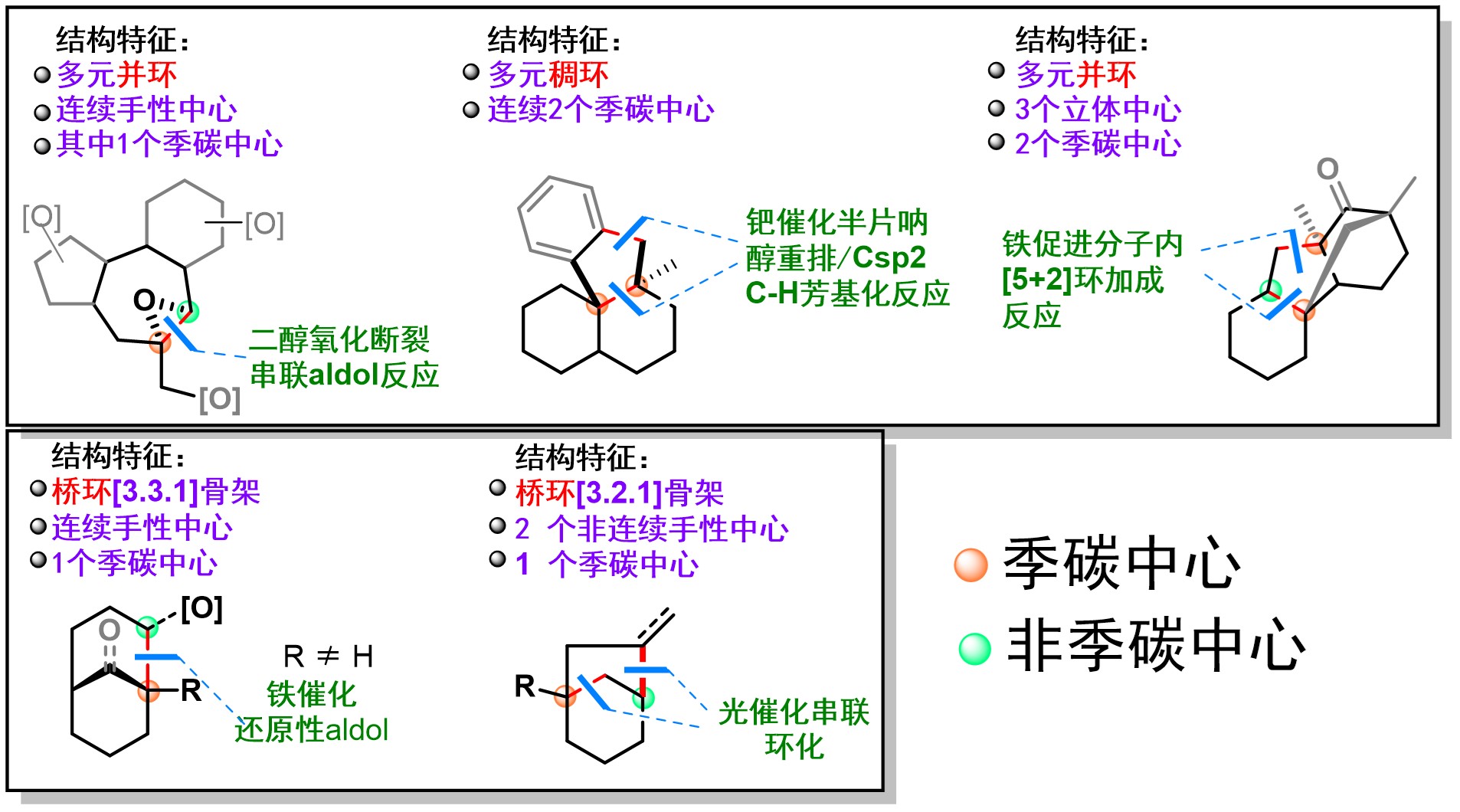 图1含季碳中心的多环骨架结构及相应合成策略