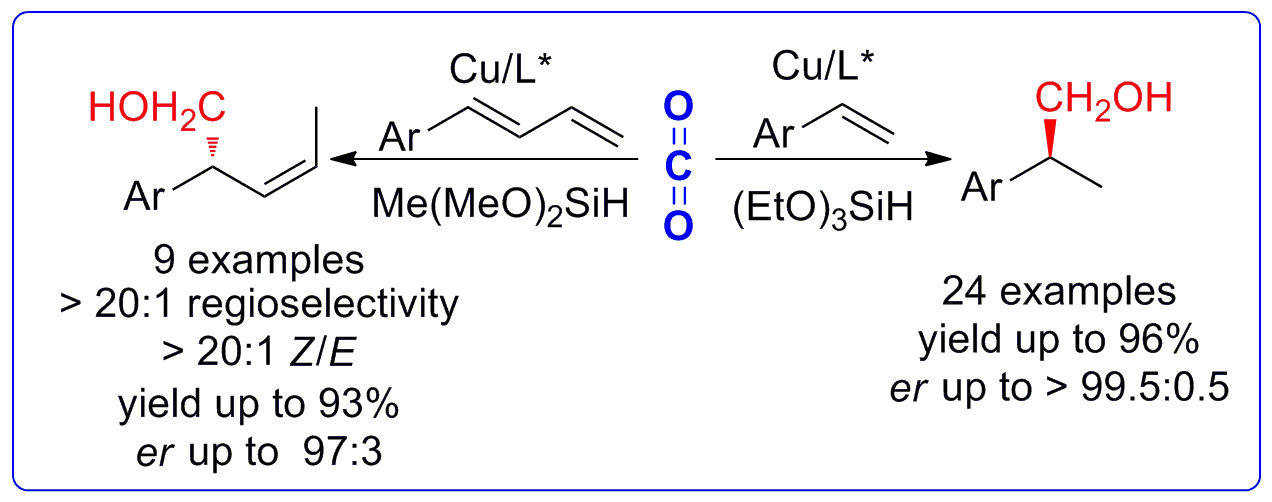 98. Y.-Y. Gui,† N. Hu,† X.-W. Chen, L.-L. Liao, T. Ju, J.-H. Ye, Z. Zhang, J. Li, D.-G. Yu*, Highly Regio- and Enantioselective Copper-Catalyzed Reductive Hydroxymethylation of Styrenes and 1,3-Dienes with CO2. J. Am. Chem. Soc. 2017, 139, 17011. († Equal contribution. Cover. Top 4 most read JACS papers in November, 2017. Highlighted by Synfacts 2018, 14, 0177, CJOC, X-MOL, OPR&D and Organic Chemistry Portal)