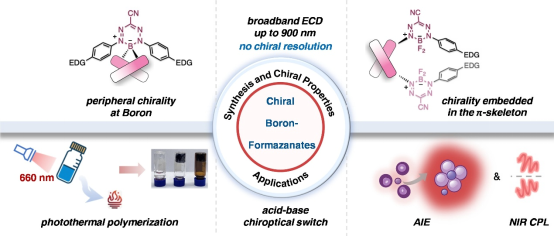 肖啸团队利用甲臜分子的近红外光响应能力,成功设计并合成了一系列手性硼甲臜盐分子,首次实现了光学纯手性硼甲臜盐的制备,且无需手性拆分。研究发现,这些分子不仅具有高效的近红外吸收与发光、宽圆二色(CD)响应和优异的光热转换性能,还能在酸碱刺激下实现可逆的圆二色信号切换,部分体系还展现出近红外圆偏振发光(CPL)特性。该工作不仅首次实现了手性甲臜类染料的光学纯合成,更通过模块化策略构建了一个多功能近红外手性平台,为发展下一代手性光电子材料、生物探针和智能响应器件提供了新思路。